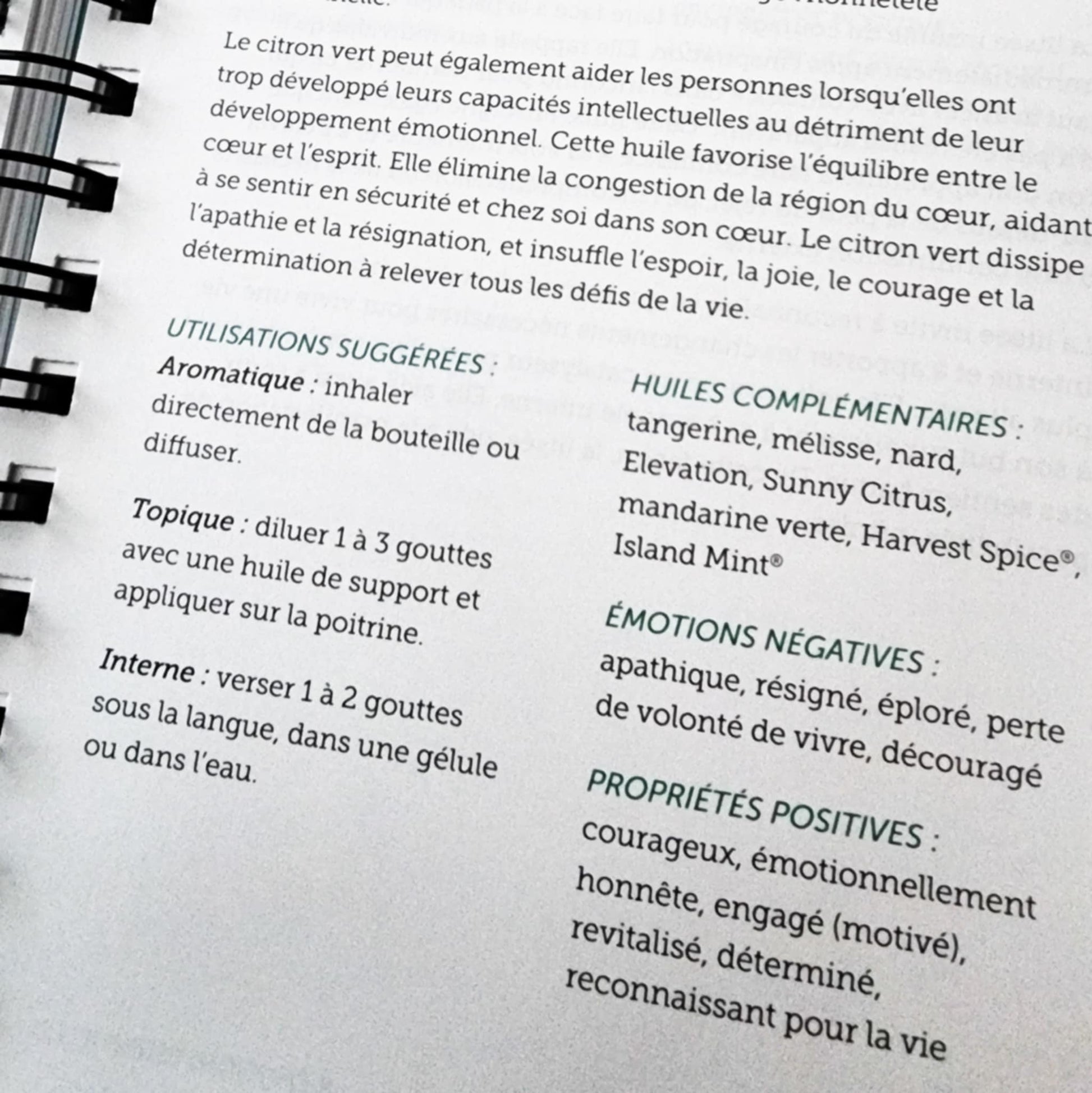 - Un répertoire complet et classé par ordre alphabétique des huiles essentielles simples et des mélanges dōTERRA®, avec une explication détaillée de leurs propriétés et de leur impact sur les émotions.