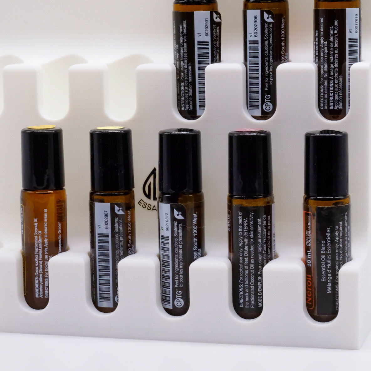 Ce support a été pensé pour les flacons de 10 ml utilisés dans les soins, les parfums naturels ou les mélanges d’huiles essentielles. Chaque fente maintient solidement le rouleau en place, tout en laissant l’avant dégagé pour voir le nom de l’huile. Son format en escalier facilite l’accès et optimise la visibilité sur une table, une étagère ou un stand.
