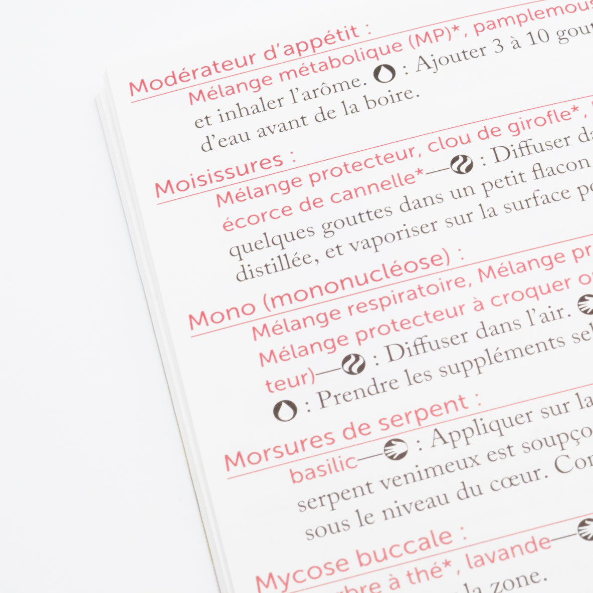 - Plus de 250 affections courantes et les huiles recommandées pour les soutenir.